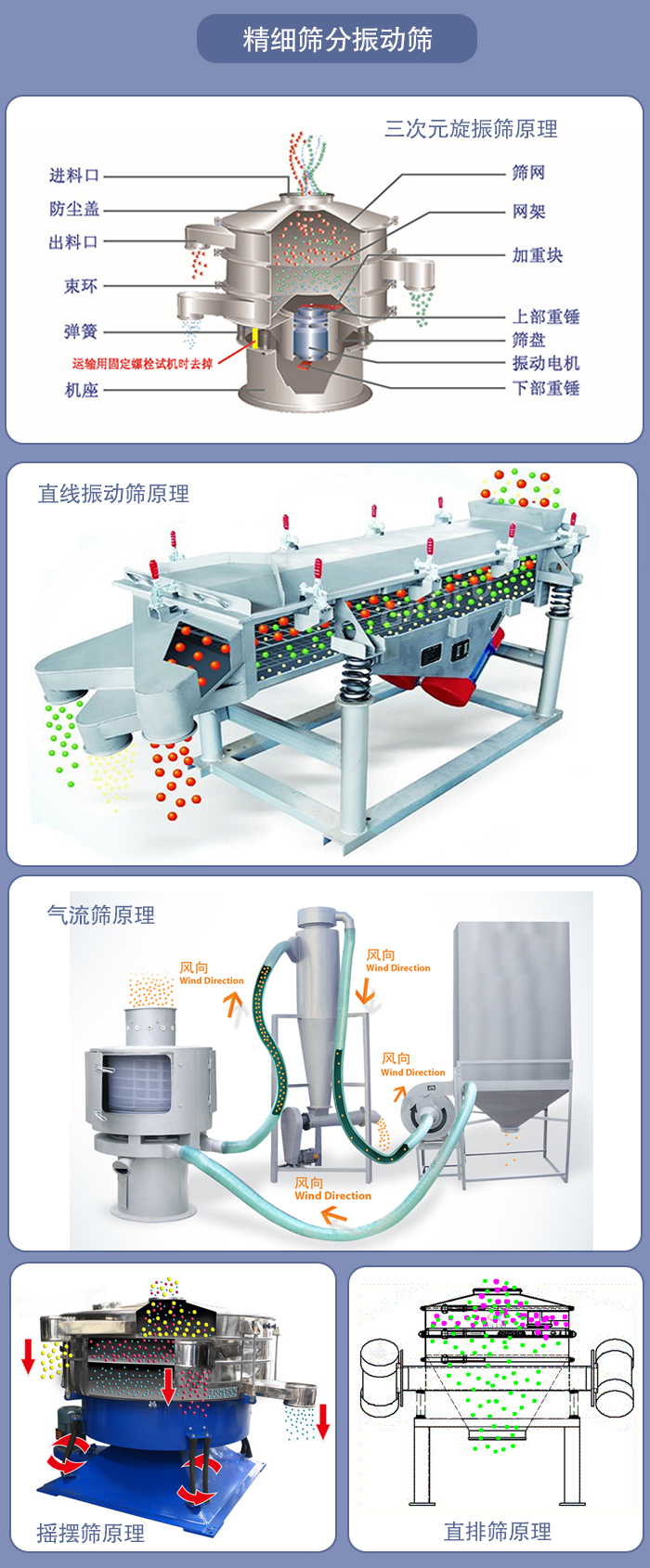 振動篩又被叫做篩粉機、電動篩,是一種適合與精細物料篩分的振動篩分機械設備,被各行各業所廣泛使用,尤其體現在食品行業和化工行業的生產活動中。振動篩設備分類廣泛,精細篩分設備是用處最廣的,那么小編今天就和大家分享精細篩分中各種篩分設備的原理。